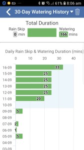 other features such as Rain Skip and you can see a history chart of when you have watered for up to 90days. So far I tend to use Odd-Even for second day watering or 7-day to create a daily schedule and skip a water if required. In summer I will be able to turn on the watering system any time I think it’s getting too hot. I can do this with the app on my phone from anywhere, so no more stressing if I can’t get home in time. Link Tap also sends me push notifications to my phone when it starts watering.