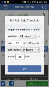 My improvement wish list for Link tap would include a ‘Skip next water only’ button. Currently to skip a water you have to swap modes completely rendering the original mode off. This means to re activate a schedule i.e. 7-day watering, you have to wait for the watering period to be finished then go back and re activate the mode you want. If you forget to reactivate an active mode then the system will remain inactive / off. Not great for fickle bonsai watering schedules that change daily. A ‘Skip next water only’ button would be perfect for resolving this. I do this mostly because of rain. There is a Rain Skip function but this is linked to local weather forecasts, something that is far too unreliable for Bonsai